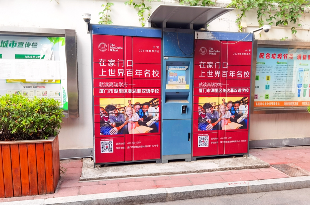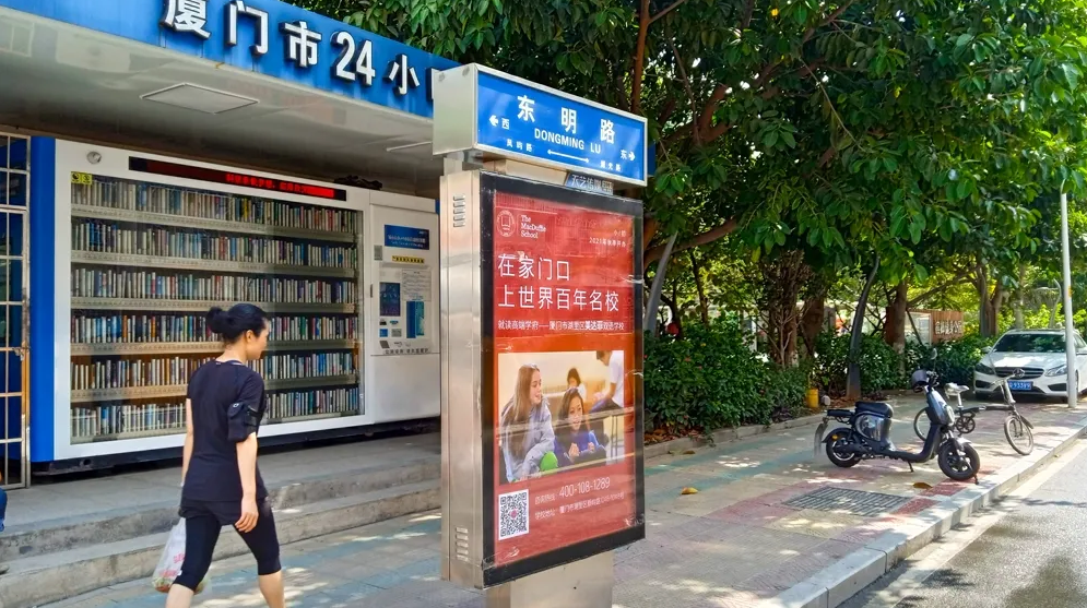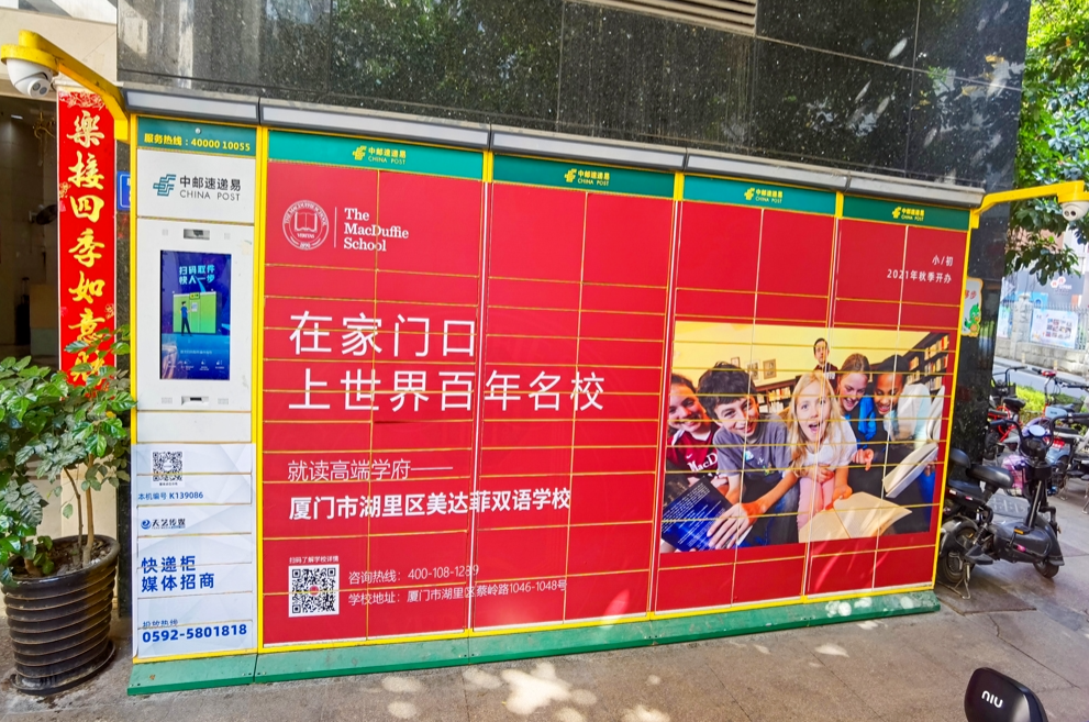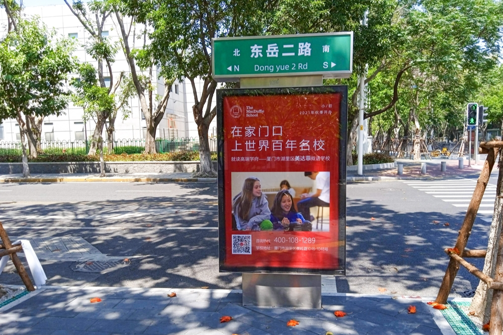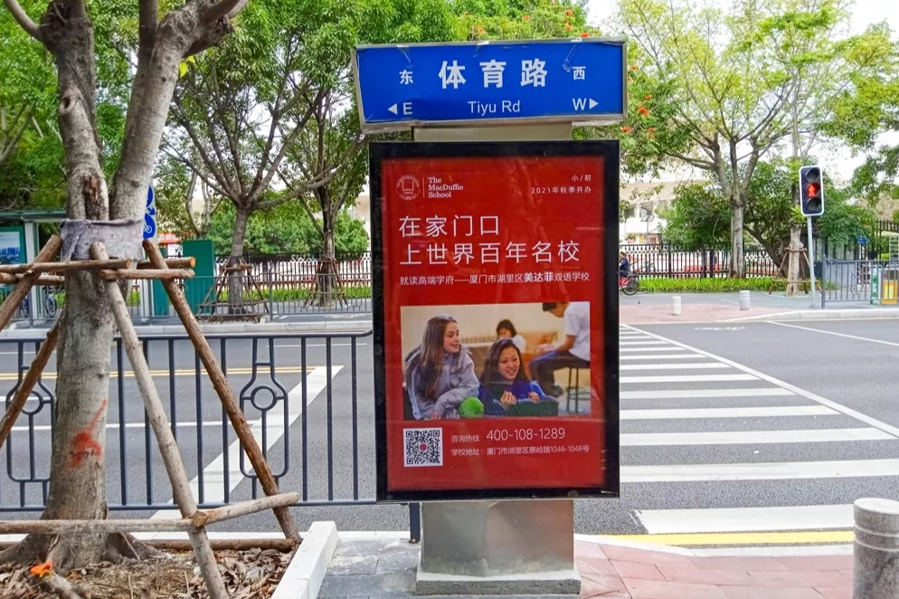 美達(dá)菲在廈門確定扎根后,重視線上線下的一系列宣傳告知,年后即開始在廈門戶外多個渠道進(jìn)行大范圍的宣傳推廣,以“在家門口,上世界百年名校”為口號,集中在五緣灣、觀音山、會展、萬達(dá)廣場、蔡塘廣場等多個中高端商圈、商務(wù)圈,以及仙岳路、廈禾路、嘉禾路等多個主干道進(jìn)行城市路名牌的投放,同時在島內(nèi)多個高端住宅小區(qū)的快遞柜進(jìn)行大幅畫面展示。