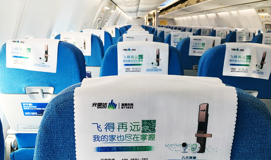 一進(jìn)入機(jī)艙,每個(gè)座椅上醒目統(tǒng)一的頭片廣告,全艙集中呈現(xiàn),營造出一種沖擊力極強(qiáng)的視覺