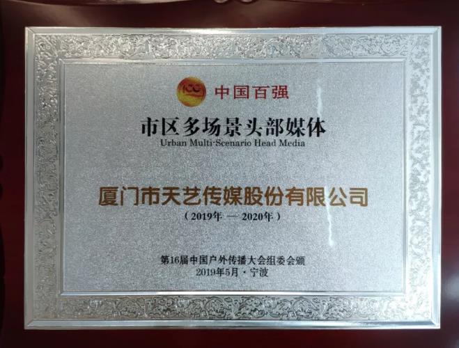 廈門市天藝傳媒股份有限公司創(chuàng)立于1993年,業(yè)務(wù)范圍覆蓋品牌管理、創(chuàng)意策劃、整合營(yíng)銷、媒體投放等傳播鏈條。公司發(fā)展26年,在戶外傳媒領(lǐng)域極具市場(chǎng)競(jìng)爭(zhēng)優(yōu)勢(shì),形成了城市路名牌、公交候車亭、站名牌、廈門國(guó)際郵輪中心媒體、廈門航空艙內(nèi)媒體、廈門機(jī)場(chǎng)手推車、網(wǎng)約車媒體等“海·陸·空”360°全媒體覆蓋。在此次會(huì)議中,廈門市天藝傳媒股份有限公司有幸榮獲《中國(guó)百?gòu)?qiáng)市區(qū)多場(chǎng)景頭部媒體》的獎(jiǎng)項(xiàng)。